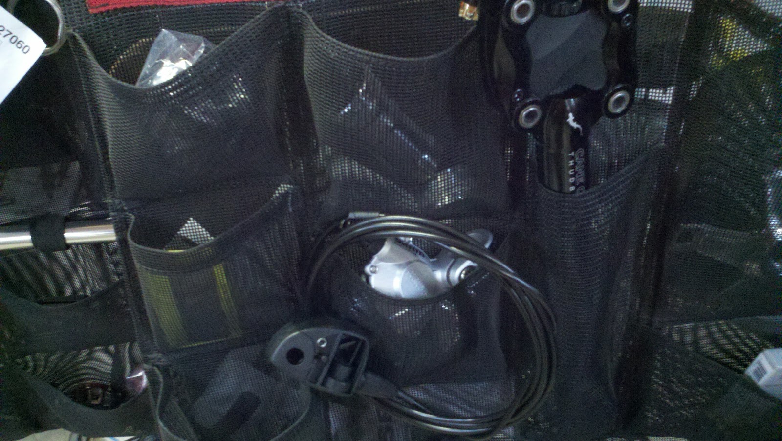 Here's a bike after cutting. This is not the exact bike since it was further back in the shop than I'm allowed to go... but you get the idea. We organize the bikes on this rack to be able to quickly tell if everything is there.